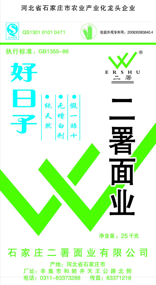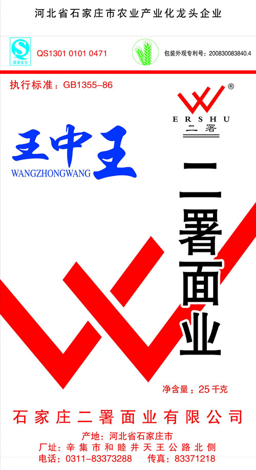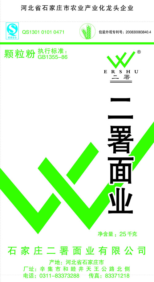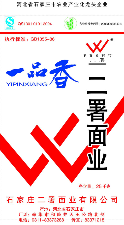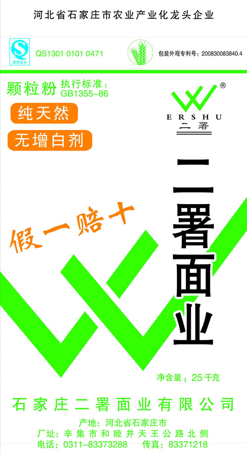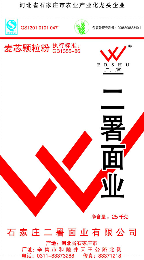河北面業(yè)         二署面業(yè)有限公司創(chuàng)建于1989年,現(xiàn)已具備日處理小麥300噸的能量,產(chǎn)品質(zhì)量穩(wěn)定,深受客戶(hù)青睞。 二署面業(yè)地理位置優(yōu)越,北靠307國(guó)道石黃高速,南鄰石德鐵路,衡井國(guó)道,交通十分方便,為貨物運(yùn)輸提供保證及時(shí)運(yùn)輸?shù)奶烊粭l件。產(chǎn)品運(yùn)銷(xiāo):黑龍江、吉林、遼寧、河北、內(nèi)蒙、陜西、山西等大中省份,贏(yíng)得了廣大消費(fèi)者的認(rèn)可。 河北面業(yè)
